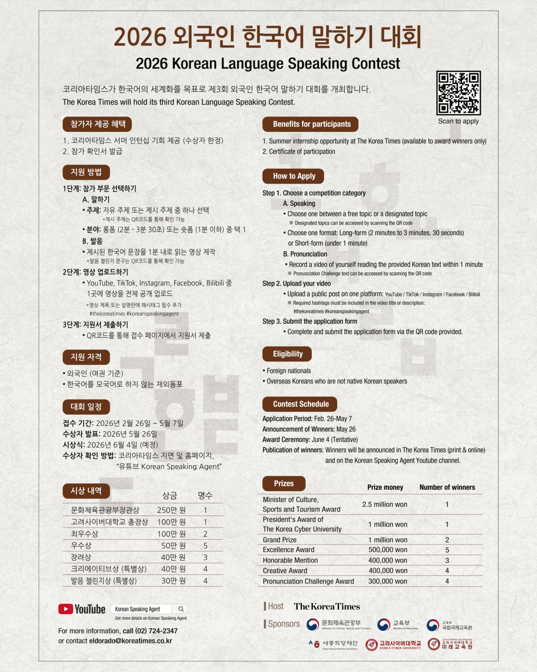 - Internship Opportunity: One winner who is currently enrolled in a university (undergraduate/graduate) in Korea will be selected for a summer internship with The Korea Times video team
